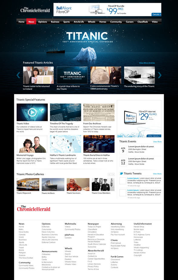 During my employment at Media Mechanics I designed the look/feel of the Chronicle Herald’s Special Coverage Website to commemorate the 100th Anniversary of the Titanic. I also produced wireframes for the project, and designed the iceberg/ship image, which was featured in much of the Chronicle Herald’s advertising and on a Feature book they produced. The template I designed was also used for their coverage of the 2012 Olympic Winter Games.